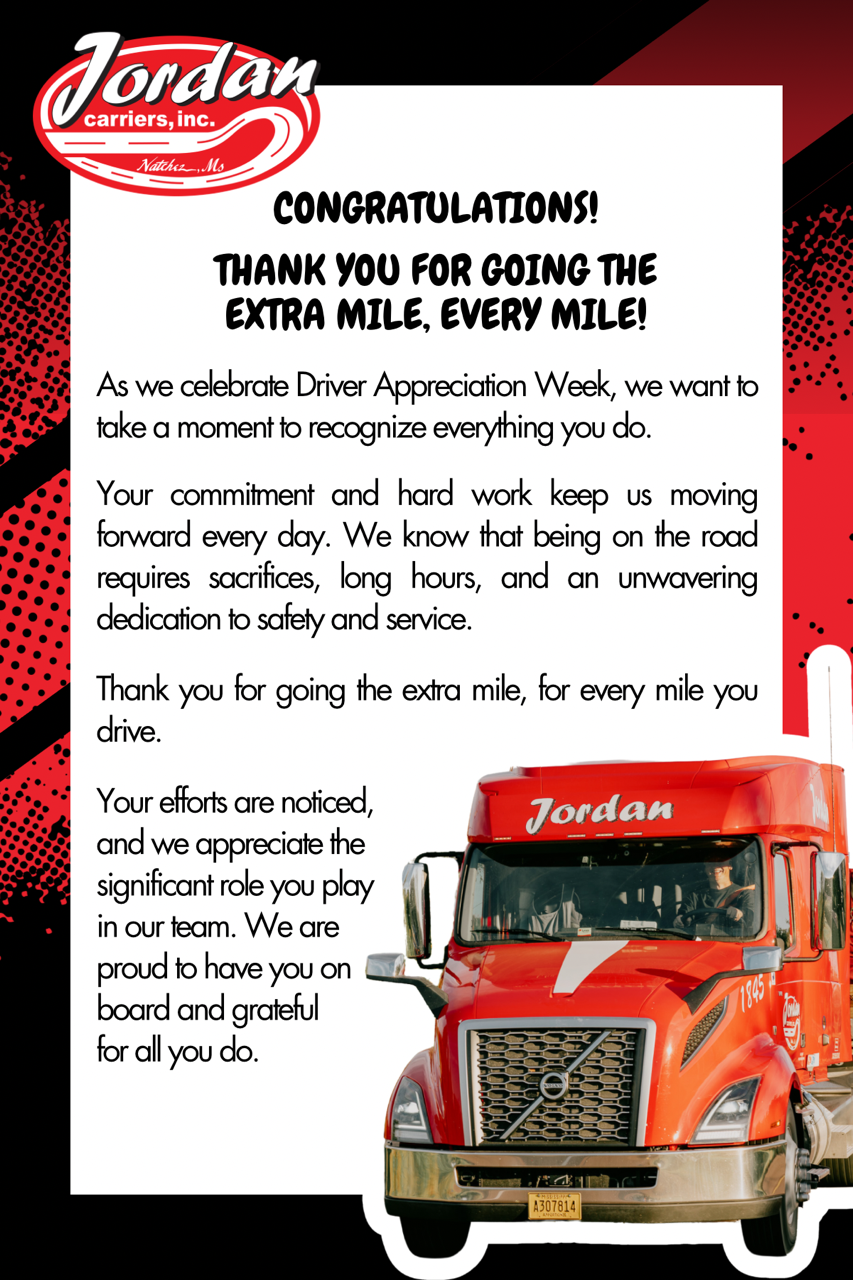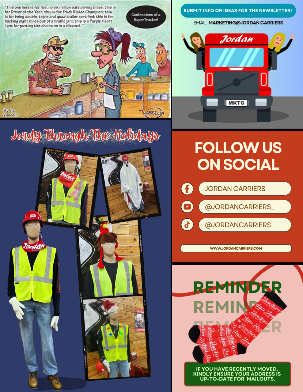 While at Jordan Carriers, I was also tasked with the social media and creating vibrant, eye-catching visuals that didn't always follow the brand's primary colors of red, black, and white. I created graphics for holidays, national observances, Driver of the Month, Fleet Manager of the Month, and more. Additionally, I posted monthly graphics recognizing drivers who passed their on-the-road inspections, including their names in the clean inspection highlights.
