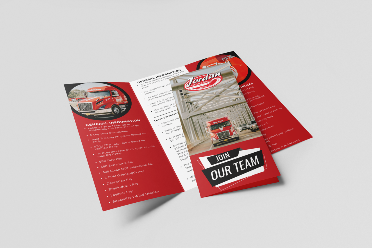 This brochure was created for drivers to distribute to potential recruits, helping to attract new drivers to Jordan Carriers.