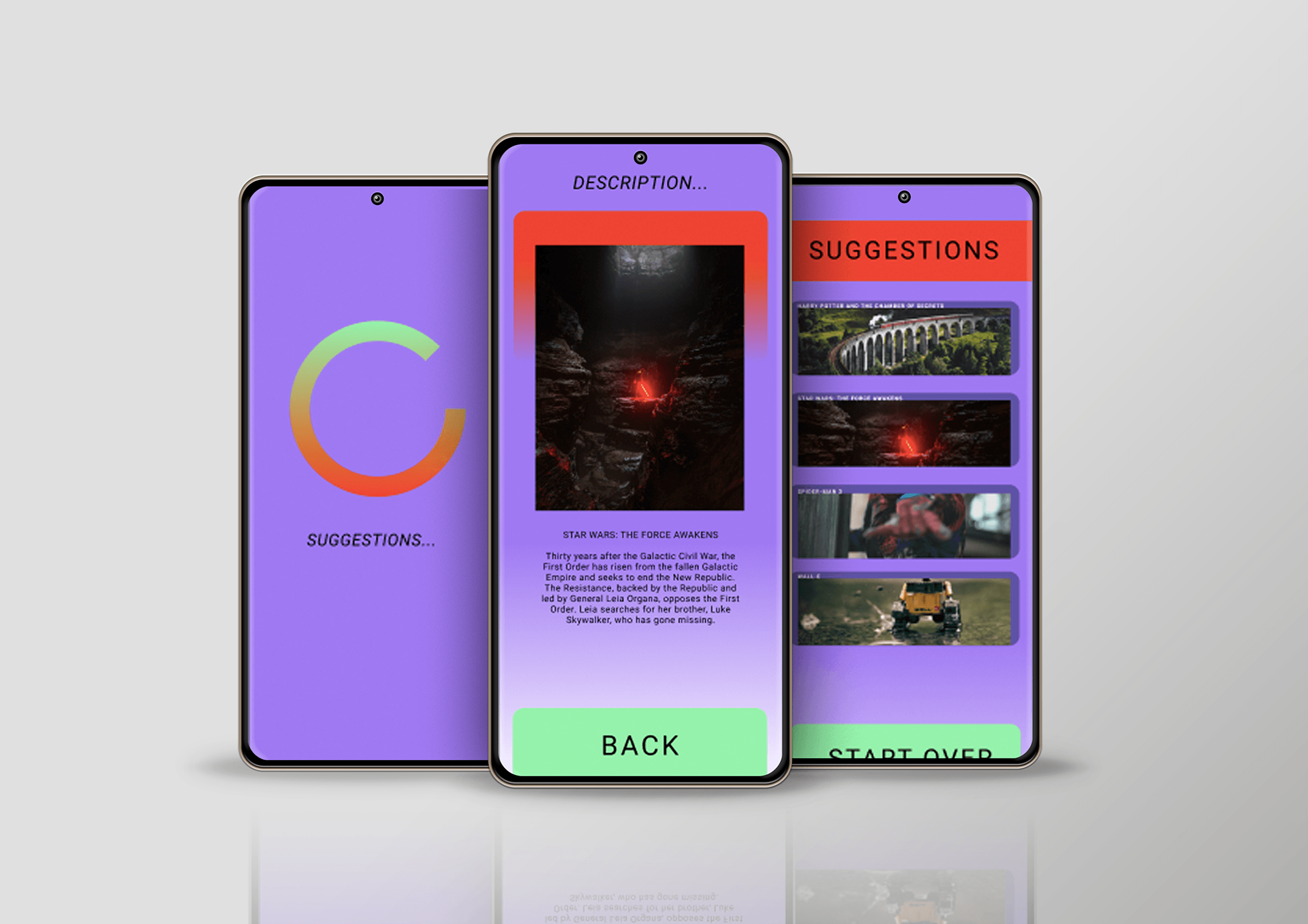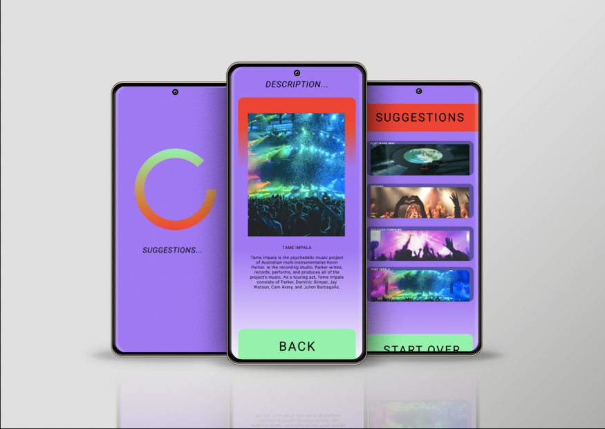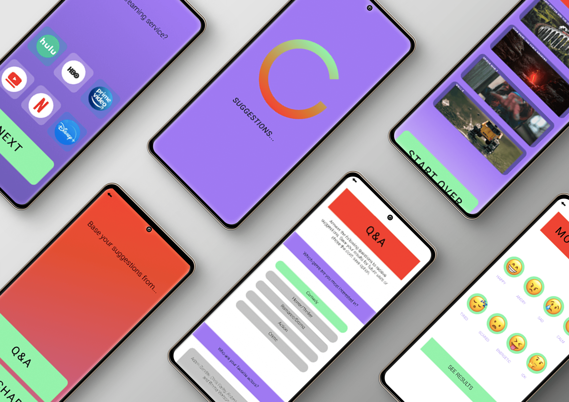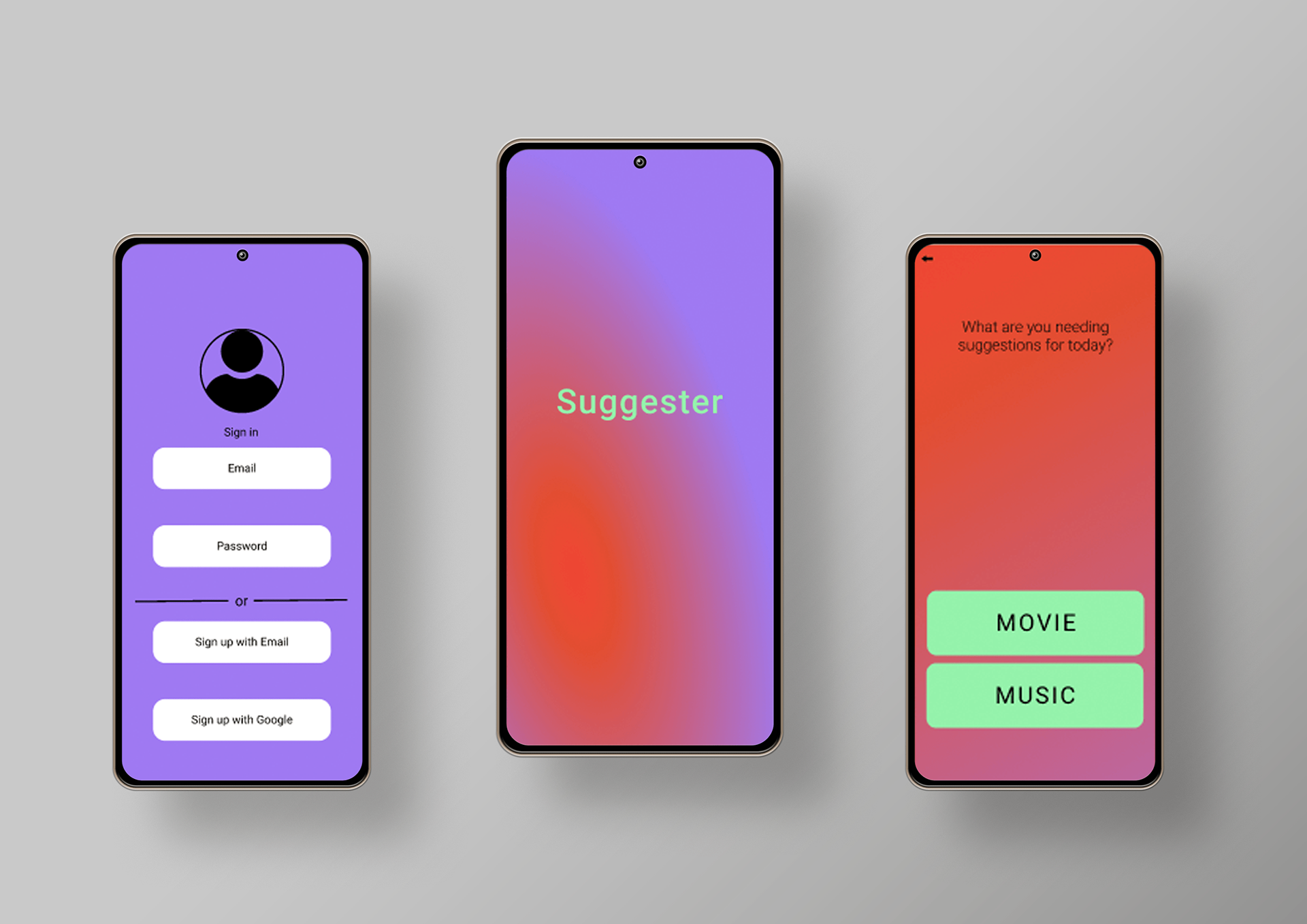 Suggester is an app that gives music or movie suggestions based on a Q&A or mood chart. The idea is that the app would give suggestions from platforms such as Spotify, Apple Music, HBO, Hulu, Netflix, and others.
